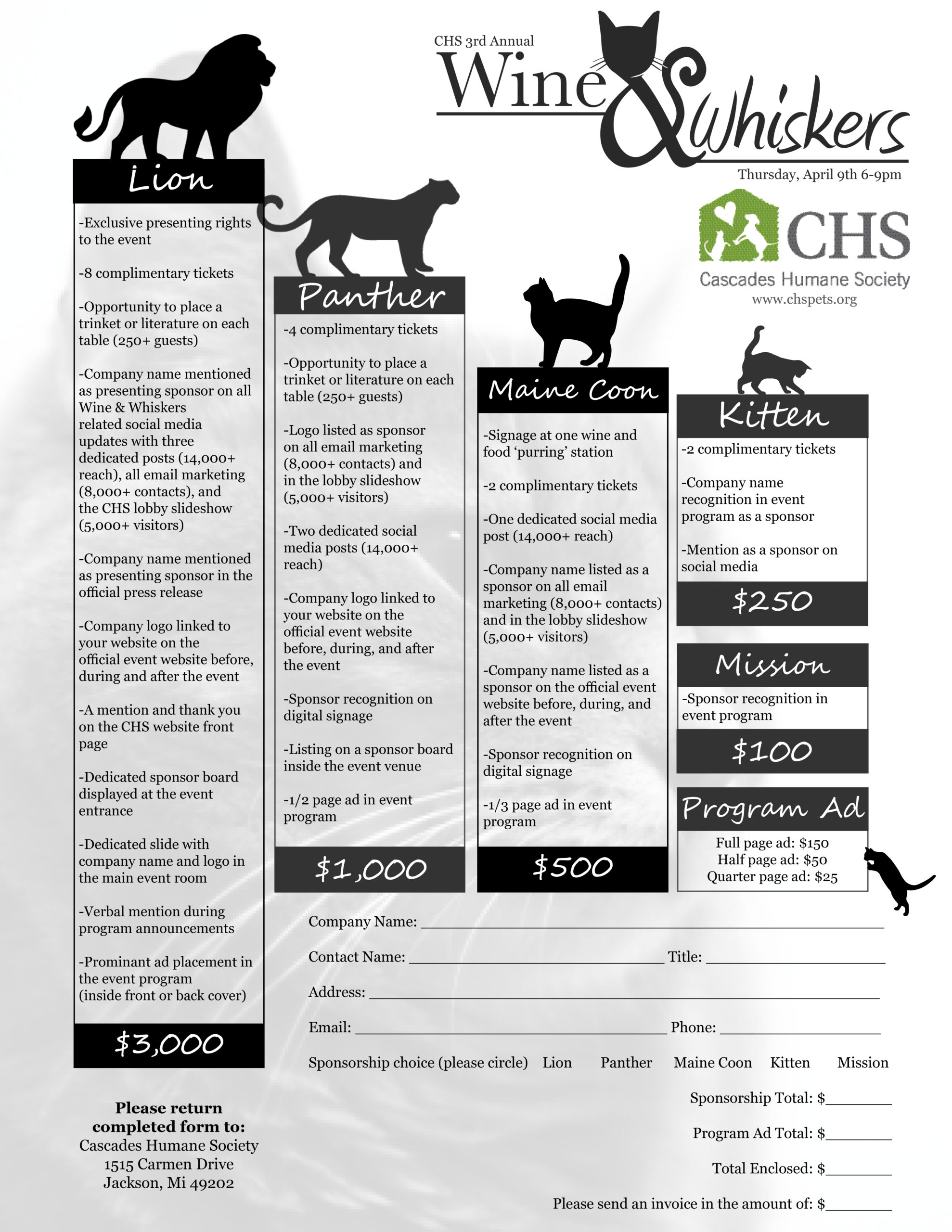 CHS is excited to announce the 3rd Annual Wine & Whiskers fundraiser, presented by County National Bank, celebrating all things cats! Wine & Whiskers is a wine and food ‘purring’ that will take place on Thursday, July 23rd from 6-9 pm at the beautiful Forty Nine South. In addition to the company of fellow pet lovers and local wine connoisseurs, guests will enjoy local wine & food pairing stations, raffles, silent auction, games and more!